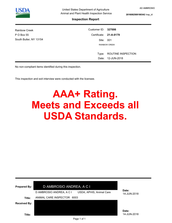 AAA+ MEETS AND EXCEEDS USDA INSPECTION REQUIREMENTS - RAINBOW CREEK KENNELS PROFESSIONAL DOG BREEDER